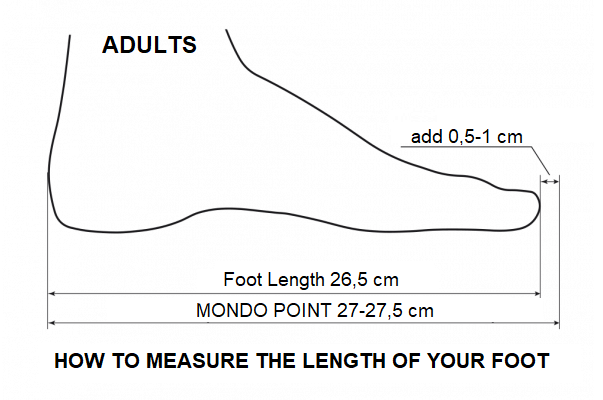 Najjednoduchší spôsob, ako zistiť svoju veľkosť, je postaviť sa pätou tesne k stene a odmerať vzdialenosť k najdlhšiemu prstu. Nameraný údaj zaokrúhlite na najbližších 0,5 cm nahor (napríklad pri 27,2 cm voľte MP 27,5). Pokiaľ patríte k lyžiarom, ktorí preferujú extra hrubé vlnené ponožky, môžete k výsledku pripočítať 0,5 až 1 celé číslo.